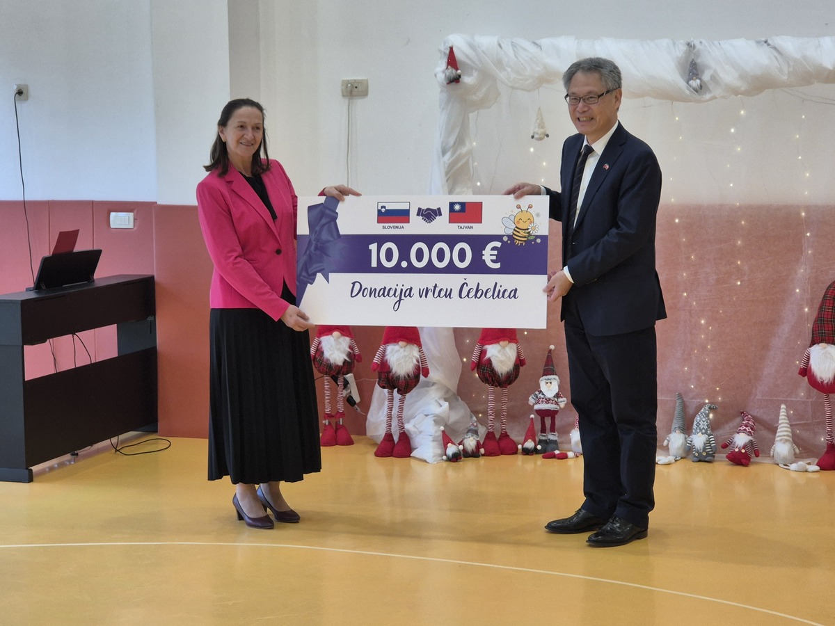 Obisk so nadaljevali v Vrtcu Čebelica Šentjernej, kjer je veleposlanik ravnateljici vrtca Ani Srpčič simbolično predal donacijo v višini 10.000 evrov. Otroci so slavnostni dogodek popestrili s pesmijo in plesom, nato pa so skupaj z gosti preizkusili nova igrala. Med doniranimi pridobitvami so dve veliki gugalnici – gnezdi, ki omogočata guganje več otrok hkrati, gugalni konjiček in zunanja miza.