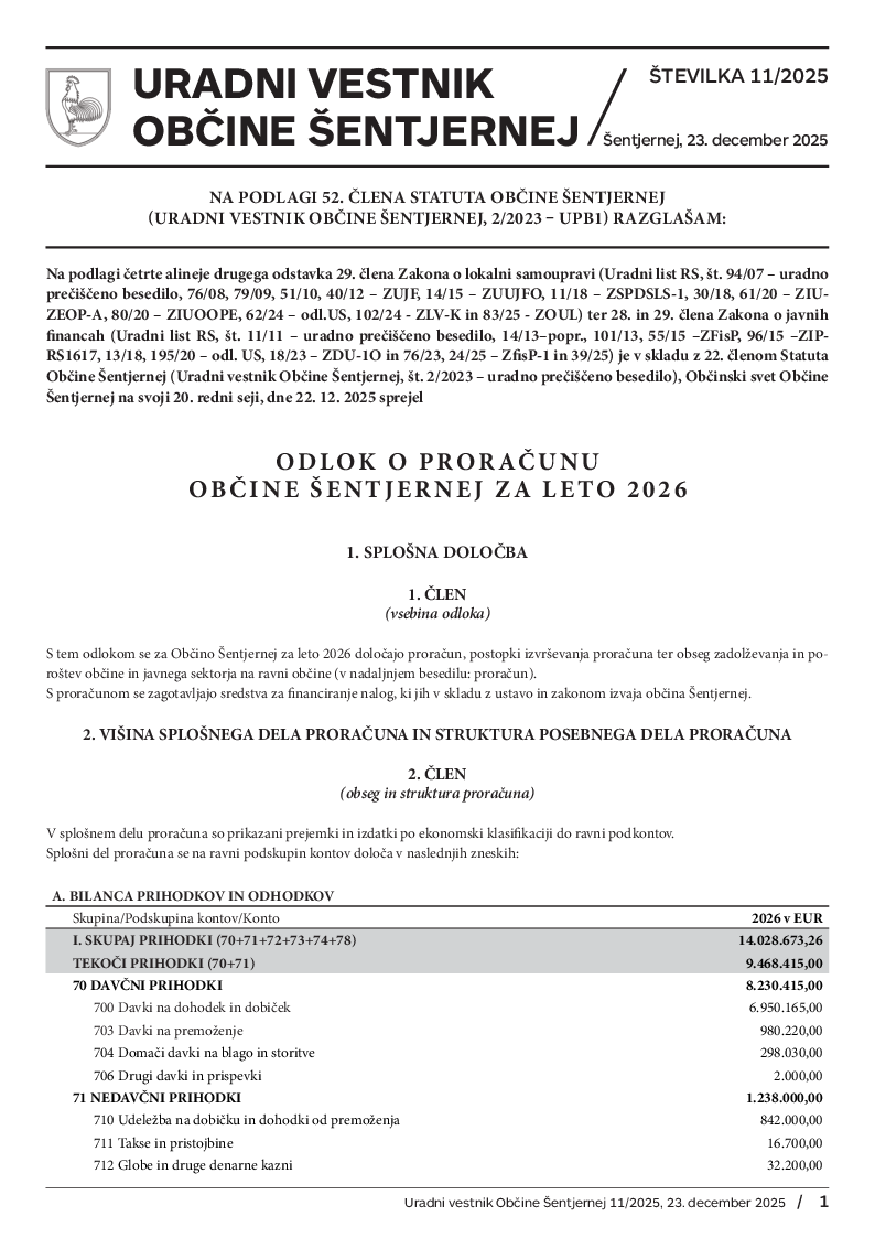 Odlok o proračunu Občine Šentjernej za leto 2026 (Uradni vestnik št. 11/2025)
