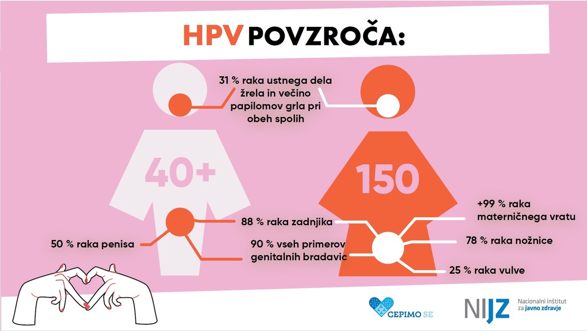 Katere bolezni preprečuje cepljenje proti HPV? Cepljenje proti HPV ne preprečuje le predrakavih sprememb in raka materničnega vratu, pač pa tudi druge vrste rakov. Trajne okužbe z nevarnejšimi genotipi HPV namreč povzročajo tudi 25-78 odstotkov drugih rakov spolovil, 88 odstotkov raka zadnjika in 31 odstotkov raka ustnega dela žrela pri ženskah in pri moških.