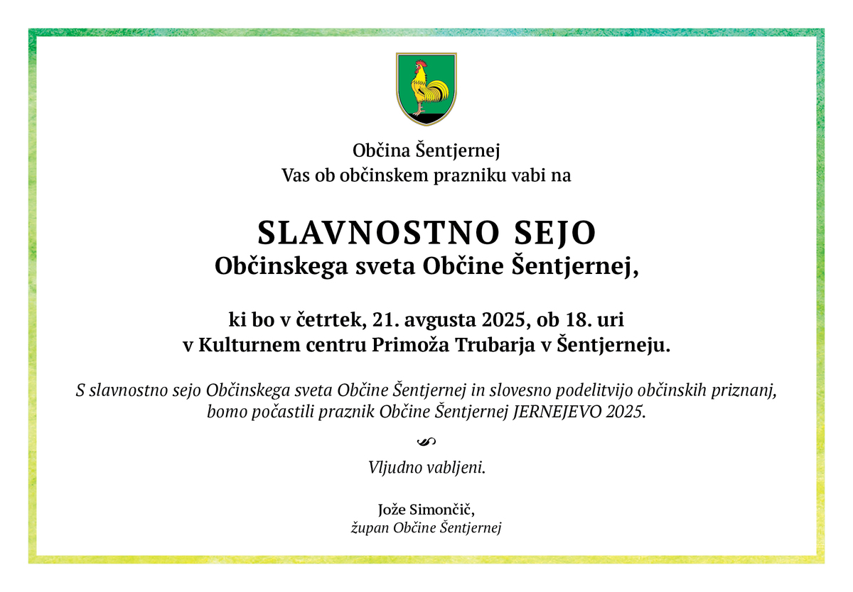 S slavnostno sejo Občinskega sveta Občine Šentjernej in slovesno podelitvijo občinskih priznanj, bomo počastili praznik Občine Šentjernej JERNEJEVO 2025.