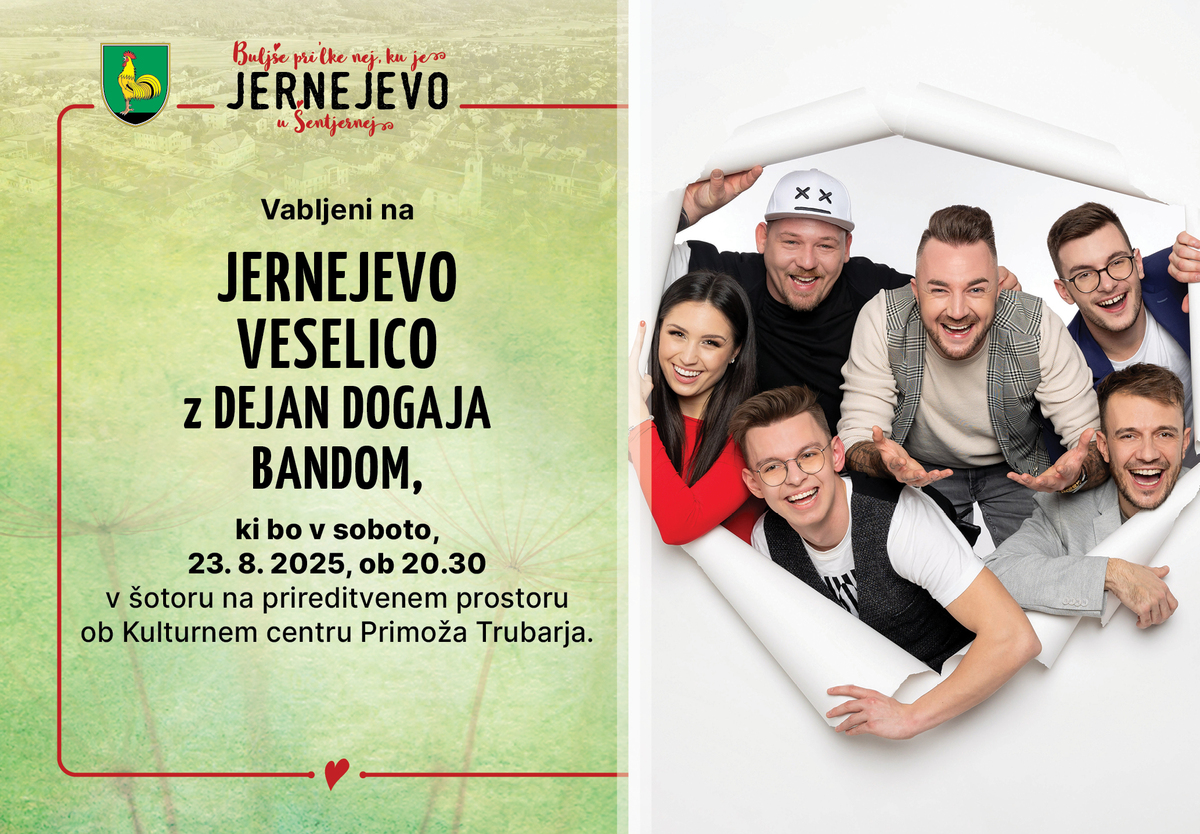 Lepo vabljeni na JERNEJEVO VESELICO z DEJAN DOGAJA BANDOM, ki bo v soboto, 23. avgusta 2025, ob 20.30 v šotoru na prireditvenem prostoru ob Kulturnem centru Primoža Trubarja.