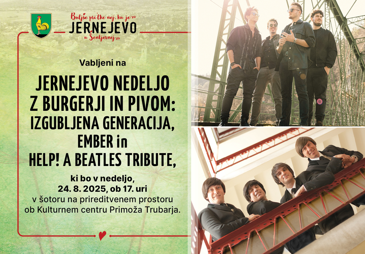Lepo vabljeni na JERNEJEVO NEDELJO Z BURGERJI IN PIVOM: IZGUBLJENA GENERACIJA, EMBER in HELP! A BEATLES TRIBUTE, ki bo v nedeljo, 24. avgusta 2025, ob 17. uri v šotoru na prireditvenem prostoru ob Kulturnem centru Primoža Trubarja.