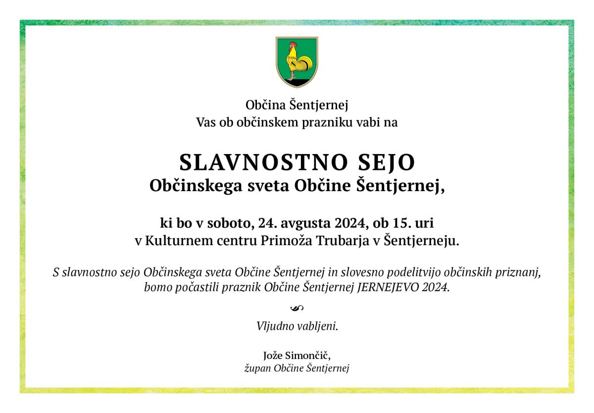 Lepo vabljeni na SLAVNOSTNO SEJO Občinskega sveta Občine Šentjernej, ki bo v soboto, 24. avgusta 2024, ob 15. uri v Kulturni center Primoža Trubarja.