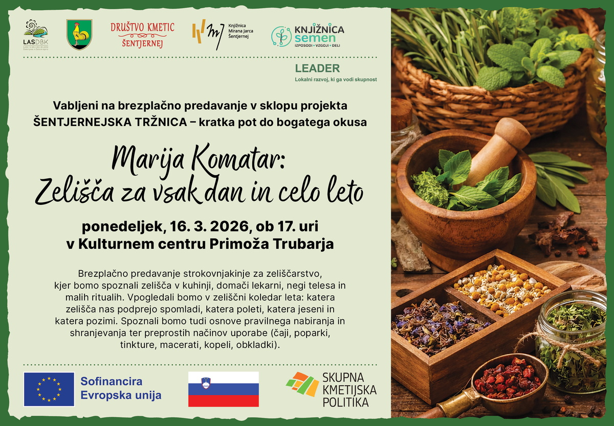 Lepo vabljeni na predavanje, v sklopu projekta Šentjernejska tržnica – kratka pot do bogatega okusa, Marija Komatar: Zelišča za vsak dan in celo leto (Društvo kmetic Šentjernej, Knjižnica Šentjernej) v ponedeljek, 16. marca 2026, ob 17. uri v Kulturnem centru Primoža Trubarja.