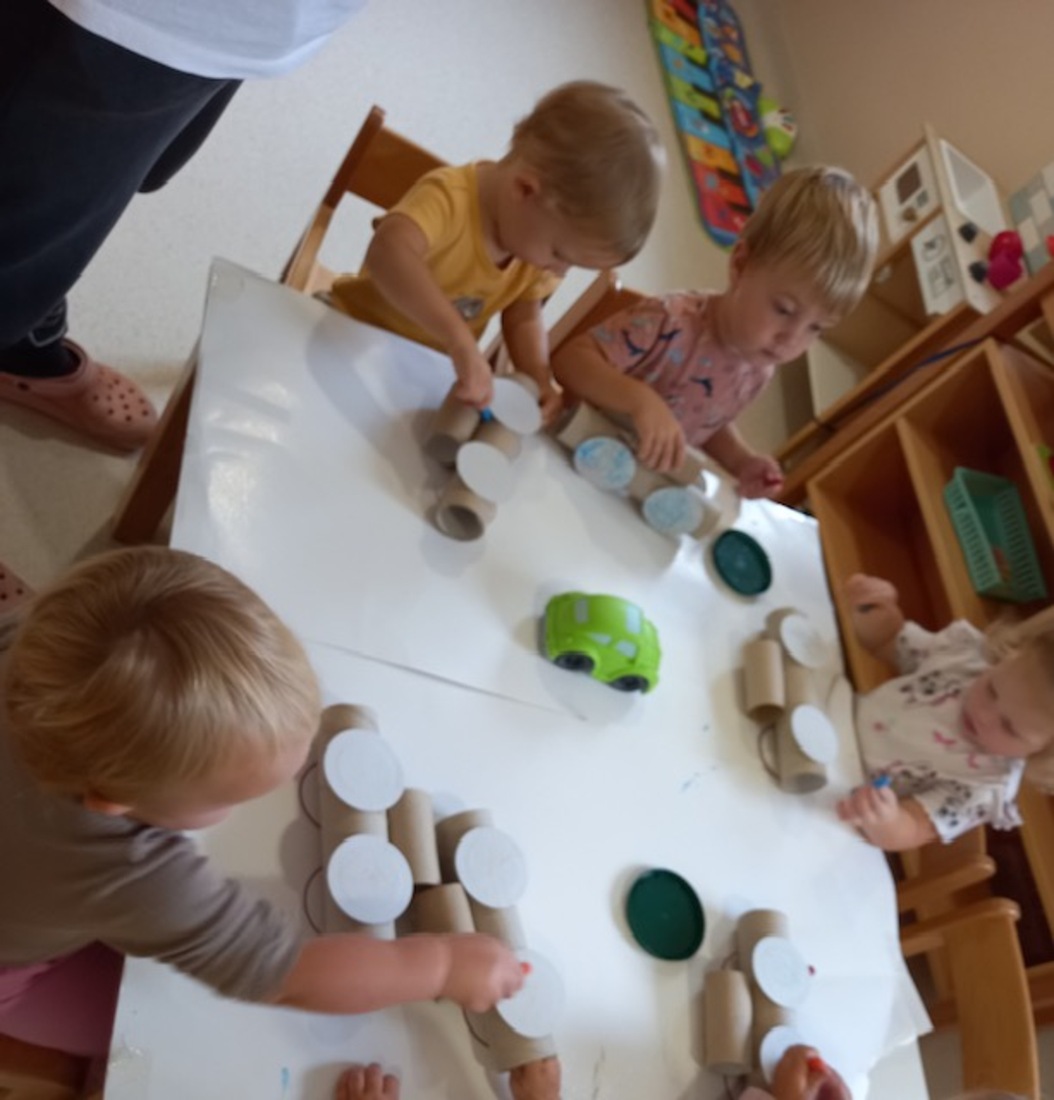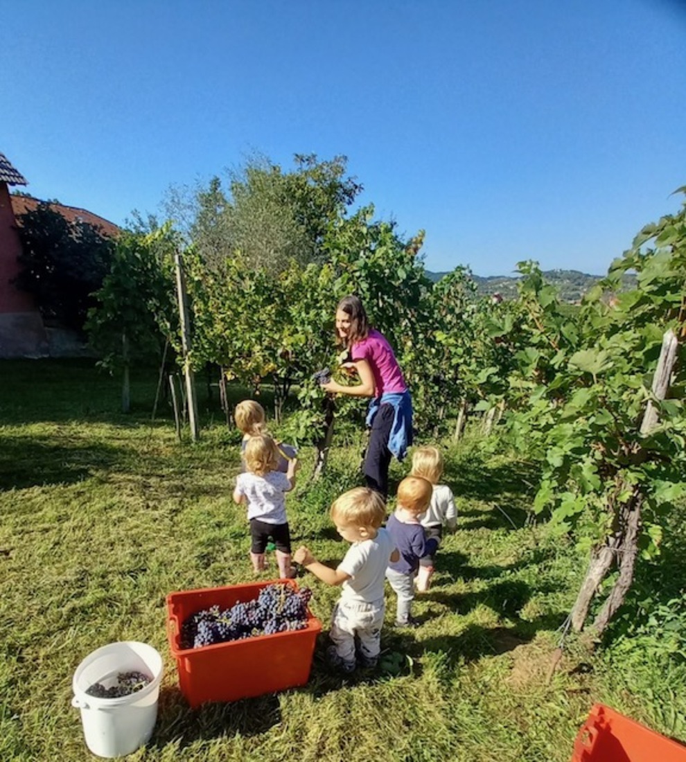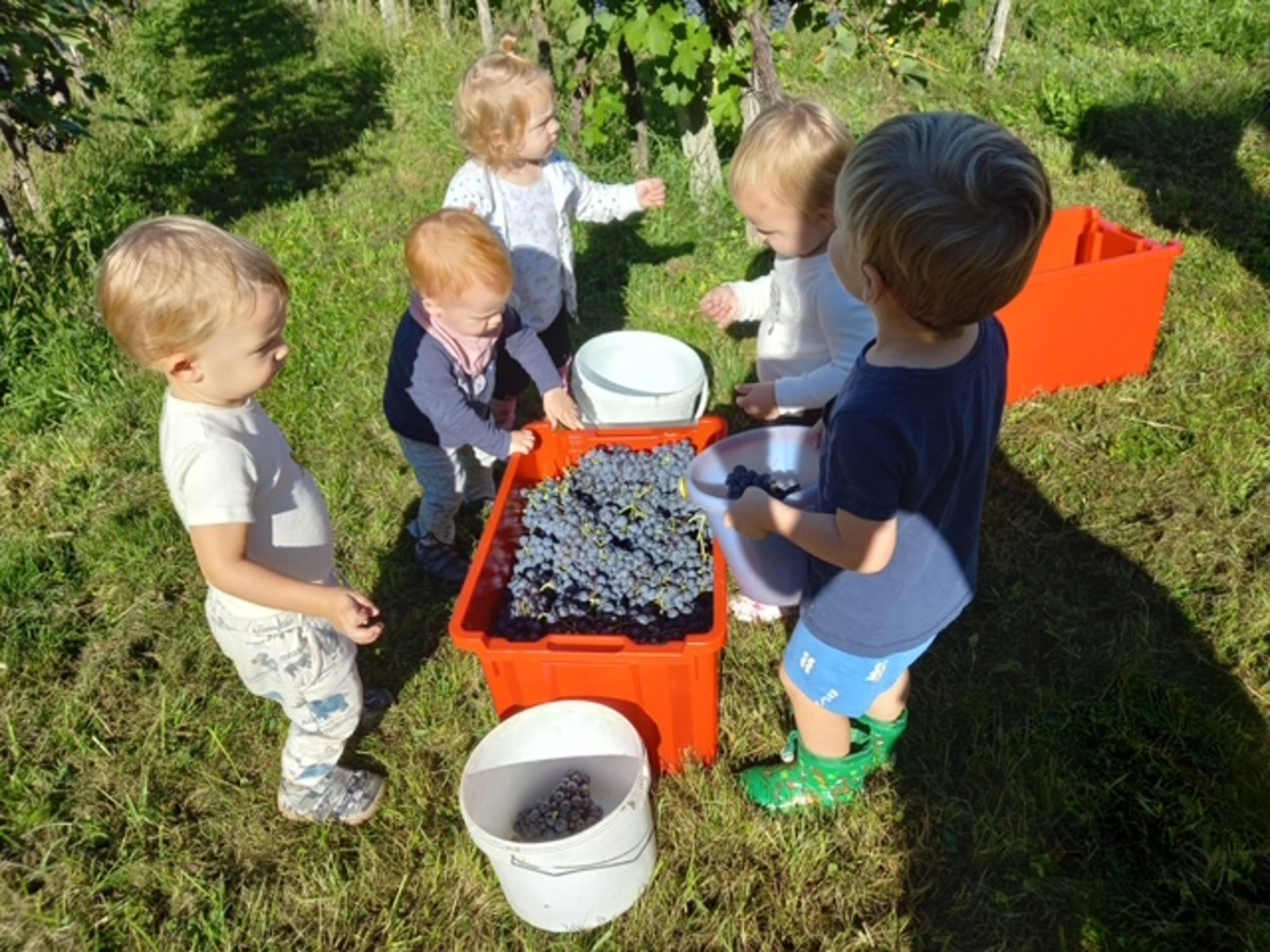 V tednu mobilnosti smo se odpravili na sprehod do vinograda in imeli svojo mini trgatev. Otroci so z veseljem polagali grozdje v vedro in ga potem starejši stresli v zaboj ter se ob tem še posladkali. Polni vtisov smo naslednji dan izdelali svoje grozdne jagode iz krep papirja in jih prilepili na obliko grozda.