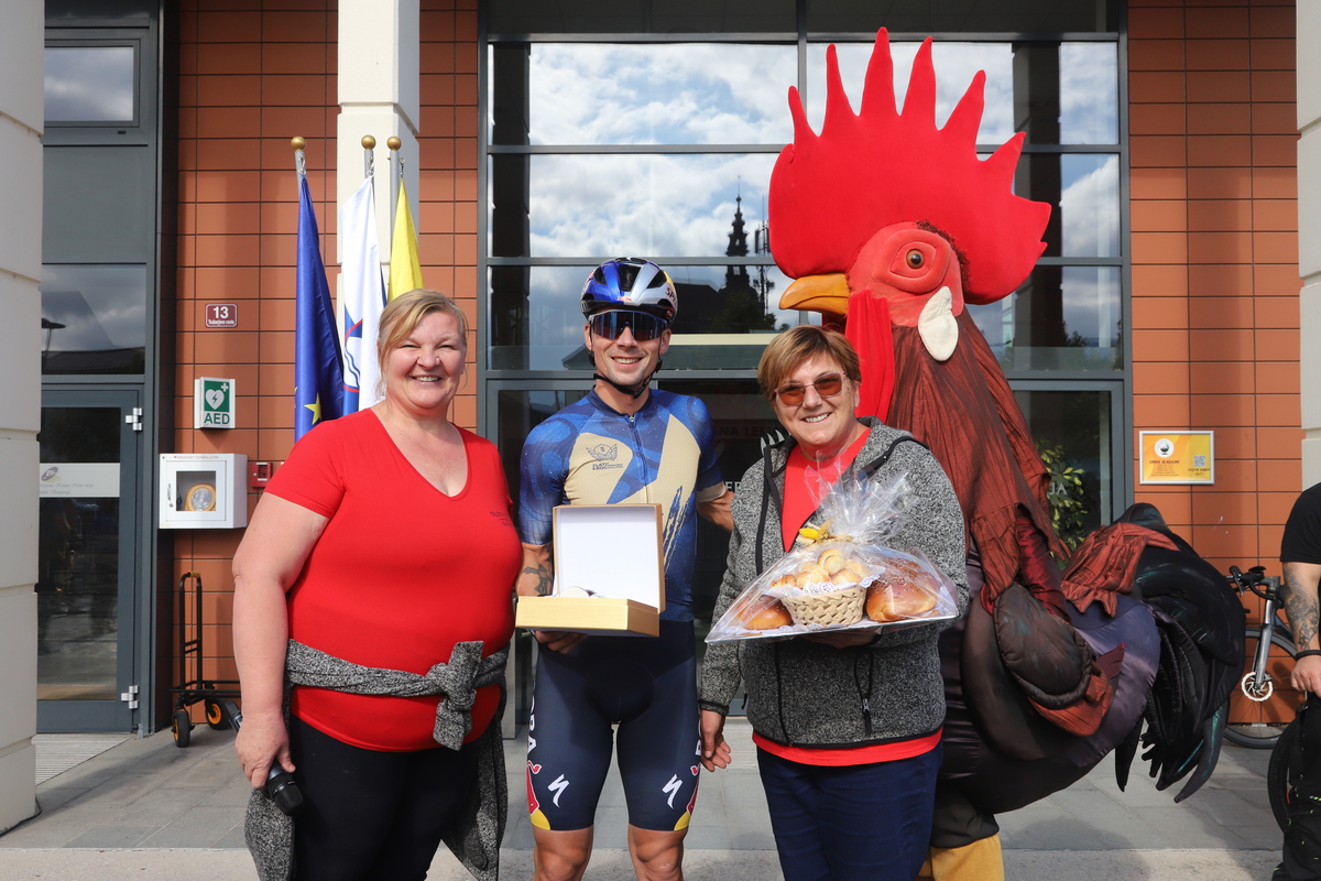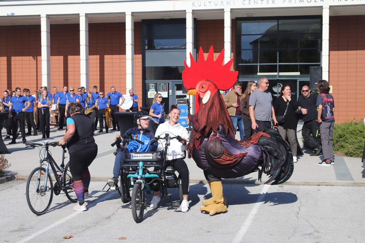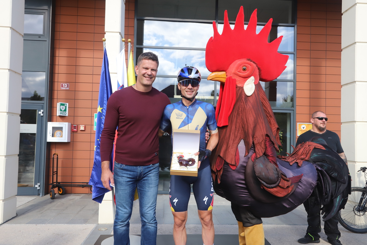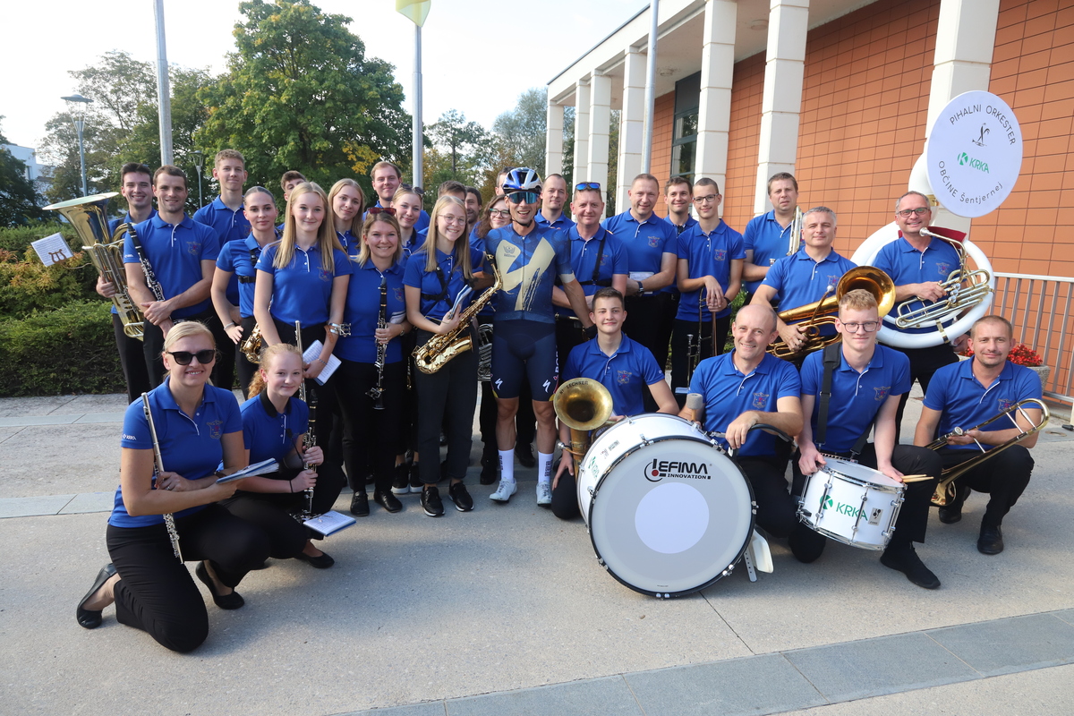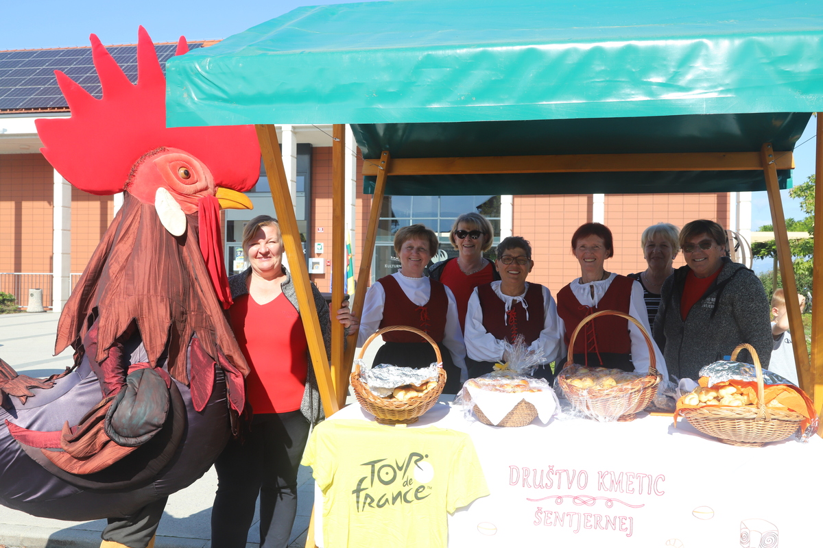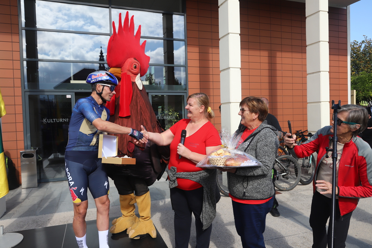 Na poti se jo kolesarska karavana, ki je zbirala sredstva za Fundacijo Primoža Rogliča, okrepčala na postojanki pred Kulturnim centrom Primoža Trubarja v Šentjerneju, kjer so Primoža pričakali številni kolesarski navdušenci, ki so ga poprosili za avtogram ali fotografijo. Vzdušje dobrodošlice je popestril Pihalni orkester Občine Šentjernej s poskočnimi koračnicami in občinska maskota, petelin Jernej.