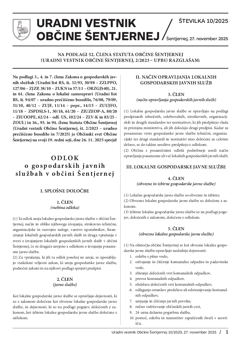 Odlok o gospodarskih javnih službah v Občini Šentjernej (Uradni vestnik št. 10/2025)