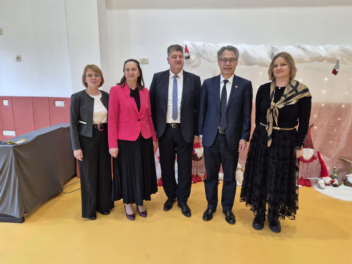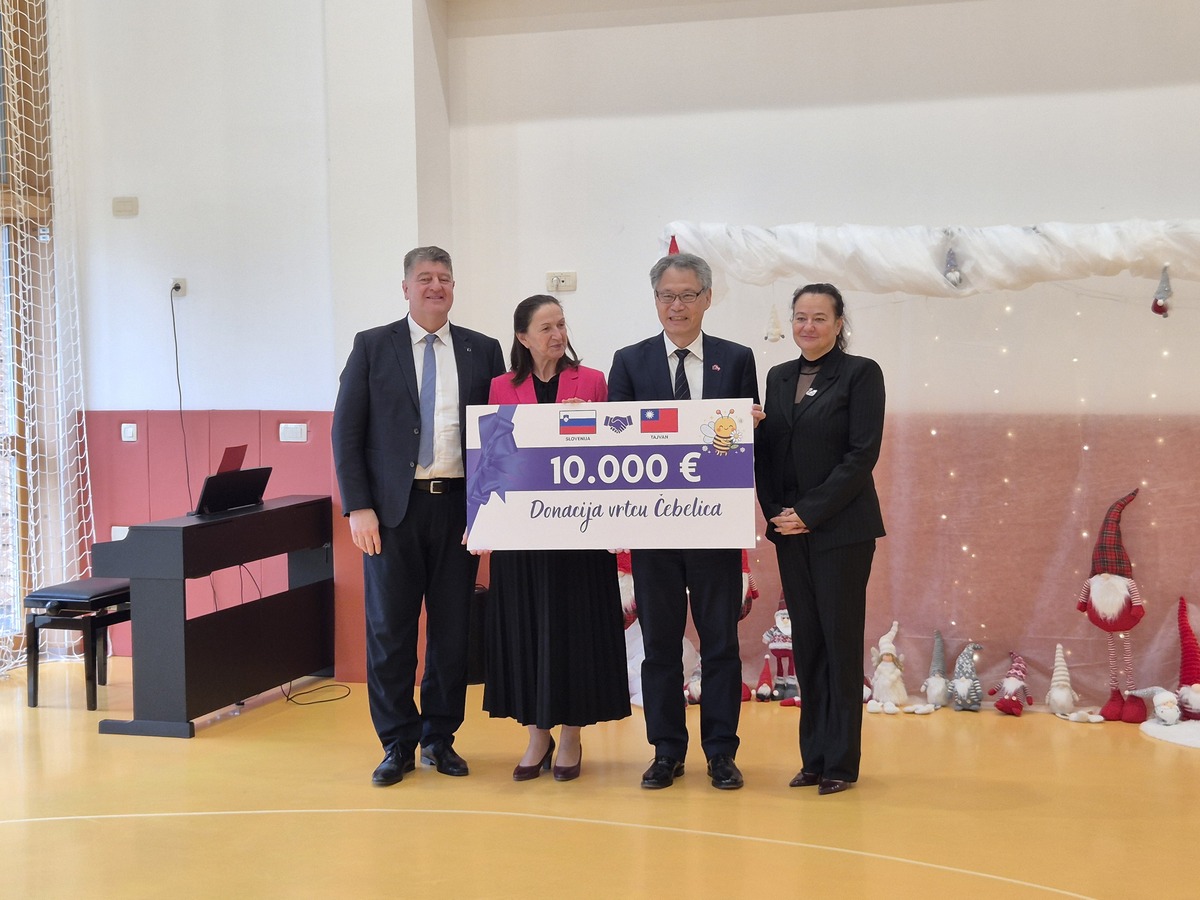 Obisk so nadaljevali v Vrtcu Čebelica Šentjernej, kjer je veleposlanik ravnateljici vrtca Ani Srpčič simbolično predal donacijo v višini 10.000 evrov. Otroci so slavnostni dogodek popestrili s pesmijo in plesom, nato pa so skupaj z gosti preizkusili nova igrala. Med doniranimi pridobitvami so dve veliki gugalnici – gnezdi, ki omogočata guganje več otrok hkrati, gugalni konjiček in zunanja miza.
