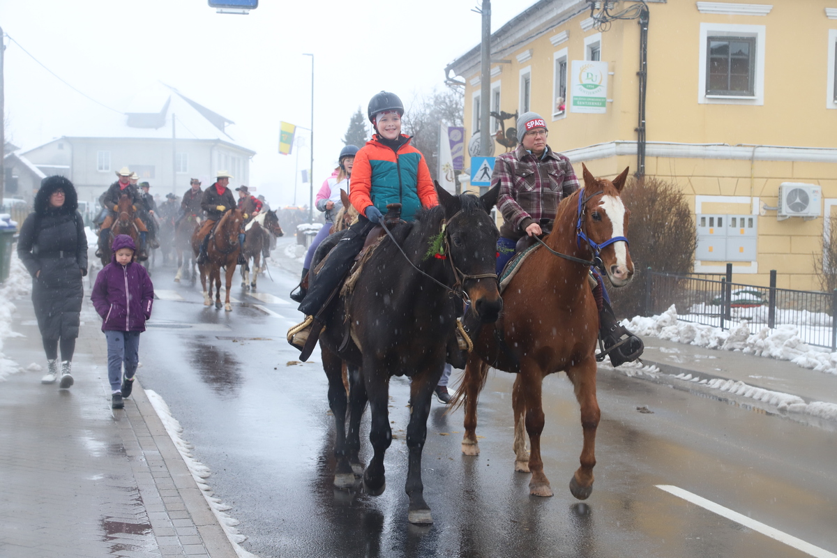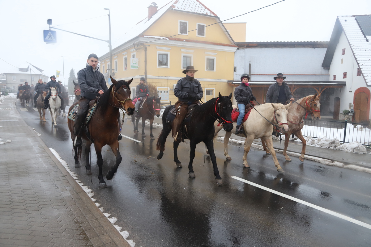 Pred samim blagoslovom je potekala tradicionalna povorka jahačev od hipodroma do cerkve v Dolenji Stari vasi. Povorki je ritem dajal Pihalni orkester Občine Šentjernej, na njenem čelu pa je ponosno jezdil praporščak Igor Jordan. Sprehod konjenikov skozi Šentjernej je bil za obiskovalce prava paša za oči in nepozabno doživetje.