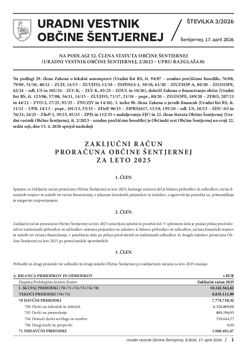 Zaključni račun proračuna Občine Šentjernej za leto 2025 (Uradni vestnik št. 3/2026)