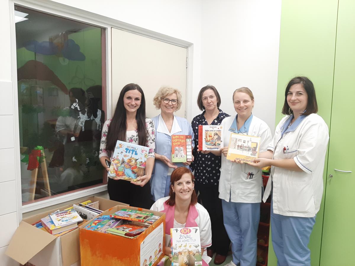V okviru projekta Bralni palček, je v Vrtcu Čebelica Šentjernej ob Tednu otroka (7. – 13. 10 2019) potekala dobrodelna akcija »podari knjigo«. Starše smo povabili, da se skupaj z otrokom odločijo in eno knjigo podarijo v dober namen. Ta akcija poteka v našem vrtcu že več let; letos smo zbrane knjige namenili otrokom, ki so v oskrbi v Splošni bolnišnici Brežice. Z ravnateljico Ano Srpčič sva jih predali osebju na otroškem oddelku, kjer je organiziran tudi bolnišnični oddelek vrtca. Igralnica otroškega oddelka je tako bogatejša za številne knjige namenjene različni starosti otrok. Vzgojiteljica Jerneja Rožman jih bo skrbno spravila na poličke in jih dnevno prebirala otrokom. Tudi medicinski delavci, ki delajo na oddelku so bili knjig zelo veseli. Z njihovo pomočjo bodo motivirali otroke v popoldanskih in večernih urah, ki so za otroka, ki mora ostati v bolnišnici lahko zelo dolge.