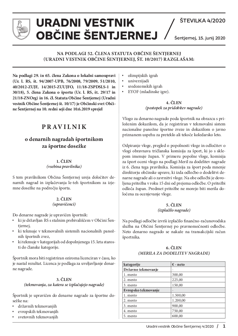 Pravilnik o denarnih nagradah športnikom za športne dosežke (Uradni vestnik št. 4/2020)