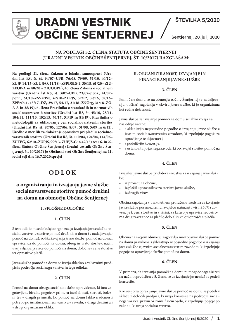 Odlok o organiziranju in izvajanju javne službe socialnovarstvene storitve pomoč družini na domu na območju Občine Šentjernej (Uradni vestnik št. 5/2020)