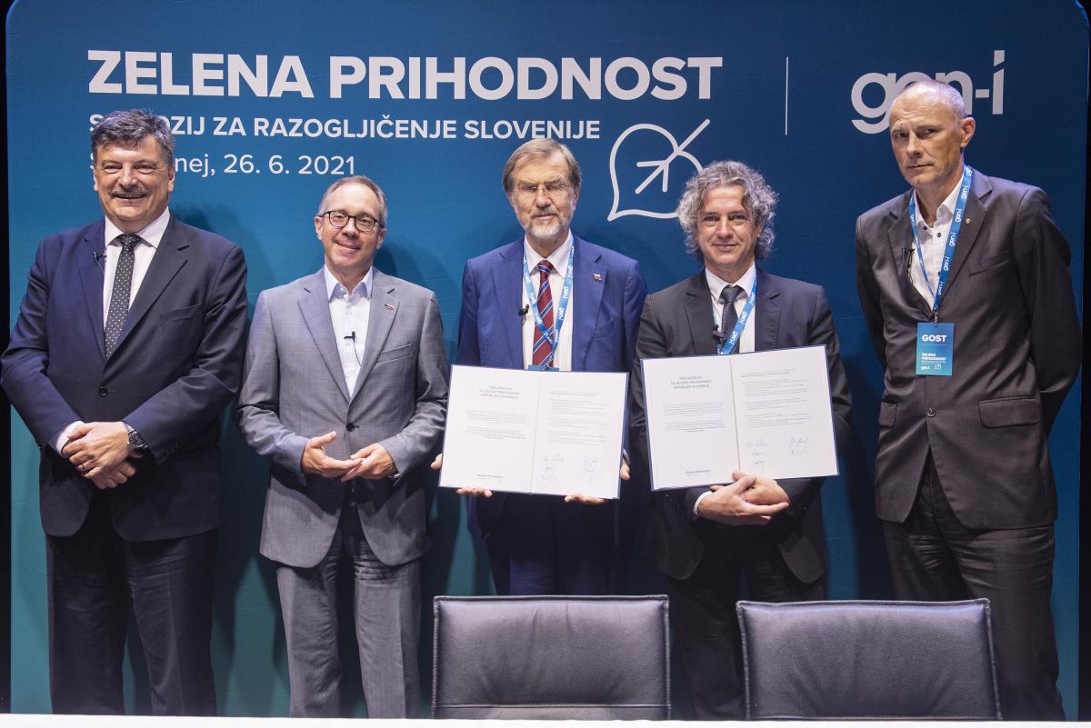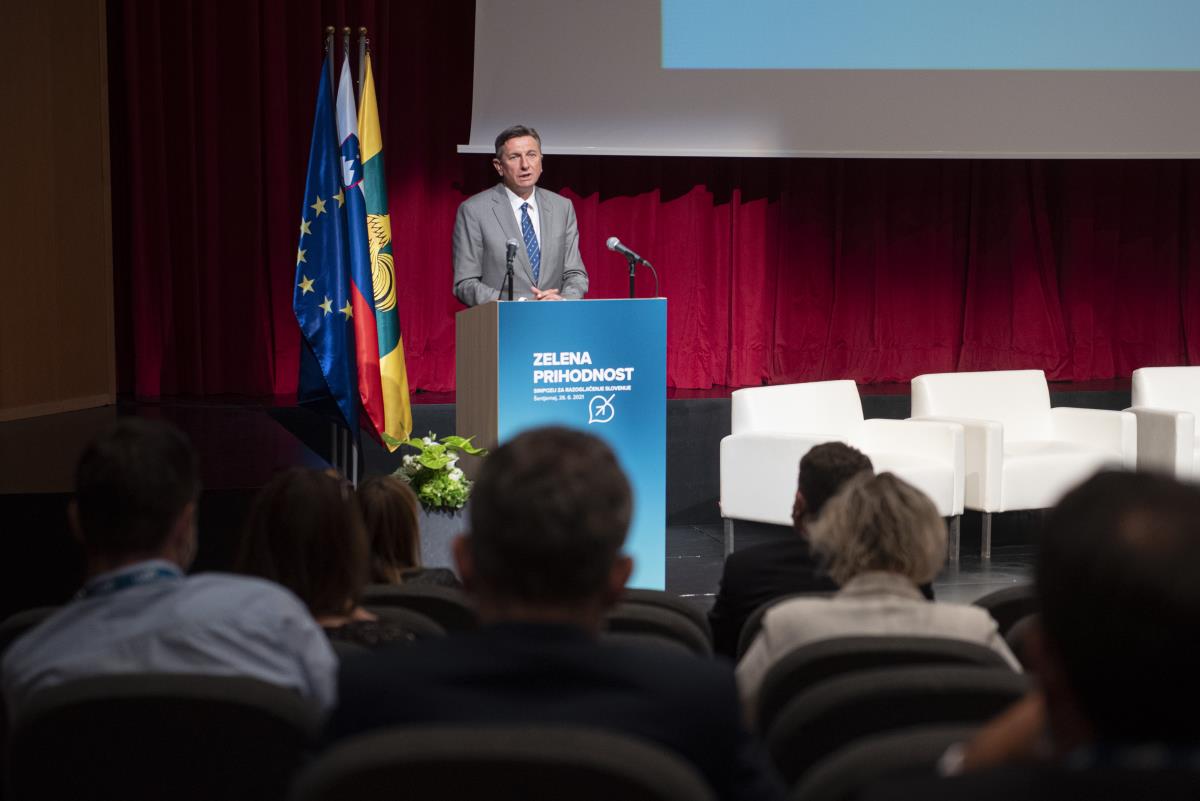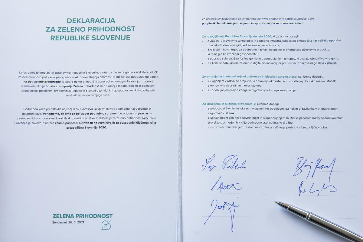 Šentjernej, 26. junij 2021 – Trideset let po tem, ko smo Slovenci ponosno in složno stopili na pot samostojnosti ter proti evropski prihodnosti, stoji naša država skupaj s svetom pred novim pomembnim izzivom – podnebno krizo, ki lahko bolj kot sam planet ogrozi predvsem ljudi, generacije naših otrok in tistih, ki prihajajo za njimi. V občini Šentjernej smo zato letošnji jubilejni dan državnosti obeležili s posebnim, v zeleno prihodnost usmerjenim, simpozijem Zelena prihodnost. Z njim želimo povezati vse deležnike, ki so in bodo soustvarjali prihodnost družbe - politiko, gospodarstvo in lokalne skupnosti za nov skupen cilj – brezogljično zeleno Slovenijo še pred letom 2050. Ob uvodnem pozdravu župana občine Šentjernej Jožeta Simončiča, je udeležence najprej nagovoril predsednik prve slovenske vlade in predsednik organizacijskega odbora Lojze Peterle, ki je izpostavil pomen medgeneracijskega sodelovanja in pozitivnega pristopa do potrebnih sprememb v luči zelene preobrazbe. Pohvalil je tudi ambicije gospodarstvenikov, da se izkažejo pri aktivnostih za razogljičenje Slovenije. Predsednik republike Slovenije Borut Pahor je izpostavil: “Zeleni evropski dogovor je izjemna priložnost, imenitno bo, če jo bo Slovenija znala izkoristiti in bo v ospredju držav, ki si bodo prizadevale za uveljavitev okoljskih ciljev. Le tako bomo ohranjali našo deželo lepo in uveljavili primerjalne prednosti, ki jih spričo naravnih danosti ima«. Pred pričetkom okrogle mize je z udeleženci svoja razmišljanja delil tudi nekdanji francoski predstavnik v Evropskem parlamentu Alain Lamassoure, ki je Sloveniji čestital za uspehe, ki jih je dosegla v zadnjih 30-ih letih.