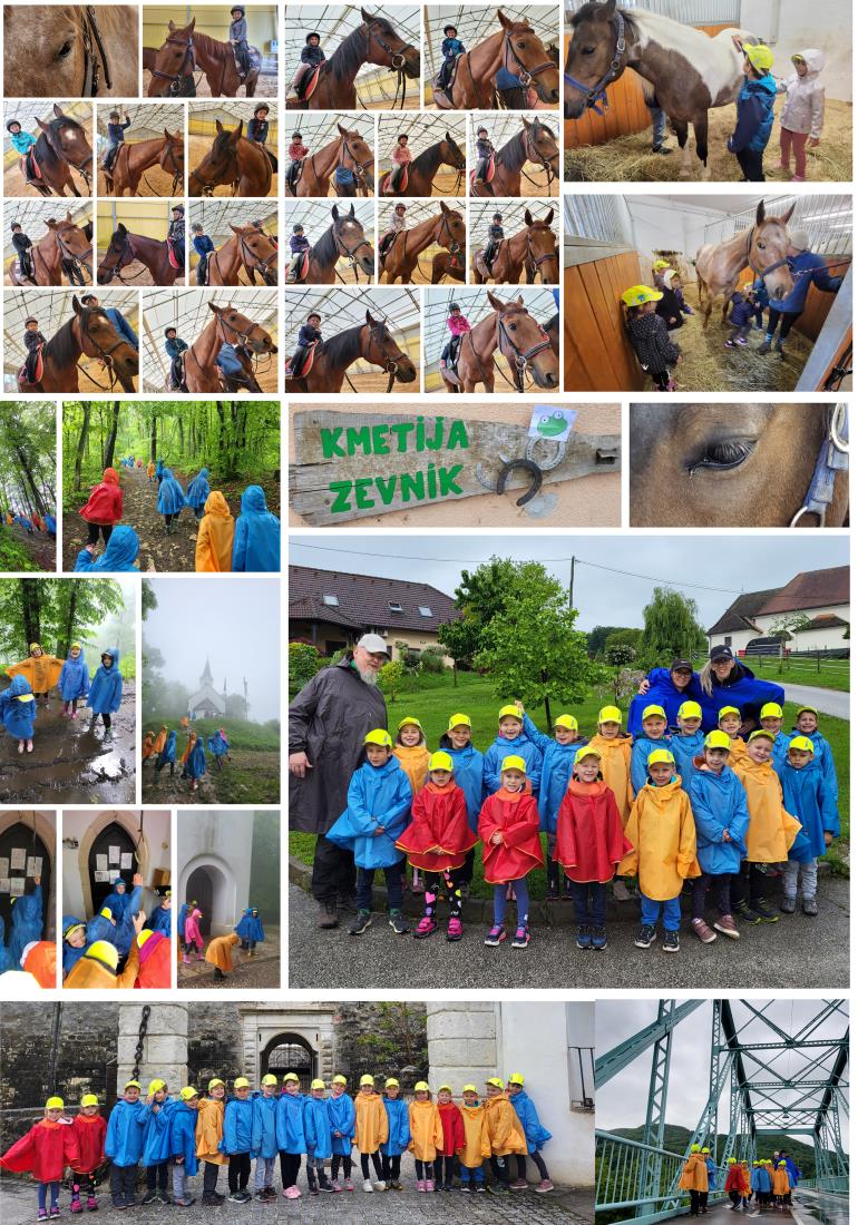 Zjutraj nas je pričakalo oblačno vreme, ki je kaj kmalu spustilo na tla tudi dežne kaplje. Okrepčali smo se z zajtrkom in se polni energije odpravili v Brežice. Med potjo smo prečkali reki Krko in Savo. Opazovali smo njun tok in združitev. Sotočja žal nismo videli, kajti drevje je že obdano z listjem in preprečuje pogled nanj. Prispeli smo do gradu v Brežicah. Ogledali smo si njegovo zunanjost, veličino in mogočnost. Otroci so nestrpno pričakovali njim ljubi del in sicer sladkanje s sladoledom. Pot nas je vodila mimo vodovodnega stolpa do slaščičarne. S potešenimi želodčki smo se med deževnimi kapljami vrnili na kmetijo. Tam pa nas je presenetilo pismo gozdno – konjskega škrata. Le ta nam je skril zaklad, ki smo po ga po nekaj zvitih namigih, ki nam jih je pustil škrat, uspešno našli.